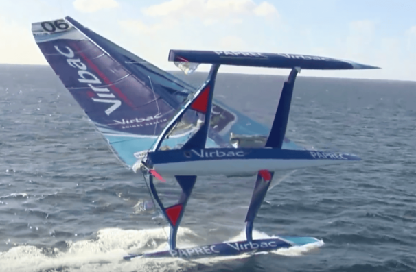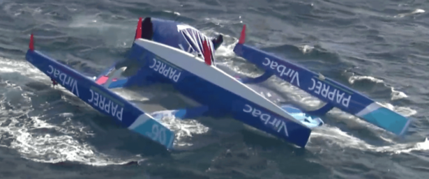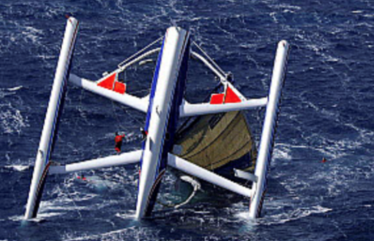 C’est l’exemple même du chavirage d’école, le multicoque pivote autour de l’axe parallèle à l’axe de symétrie du bateau et pasant par le centre de carène du flotteur sous le vent. Le CG (centre de Gravite décrit un cercle et lorsqu’il dépasse la verticale du centre de carène, le Trimaran chavire vers la deuième position stable: CAPSIZE (mat à le verticale sous l’eau).