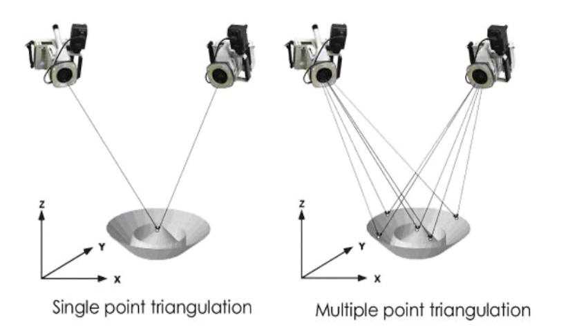 Plusieurs « points de vue » (positions successives de l’appareil photo) génèrent des droites de visées passant par les points identifiés sur la surface. Par itérations successives des coefficients des équations des droites (logiciel ad hoc) on arrive à calculer les coordonnées X, Y Z de chaque point dans le repère objet.